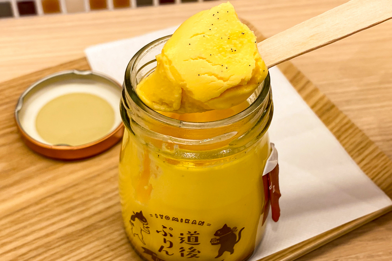 一番人気の道後ぷりんには愛媛県産のみかんが入っていて、その他季節のぷりんやコーヒー牛乳ぷりんなどもある。