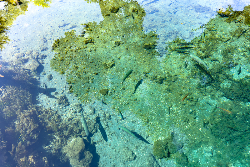 ものすごく綺麗な水の色と、池の底や魚が泳いでいるのがハッキリと見える透明度の池。